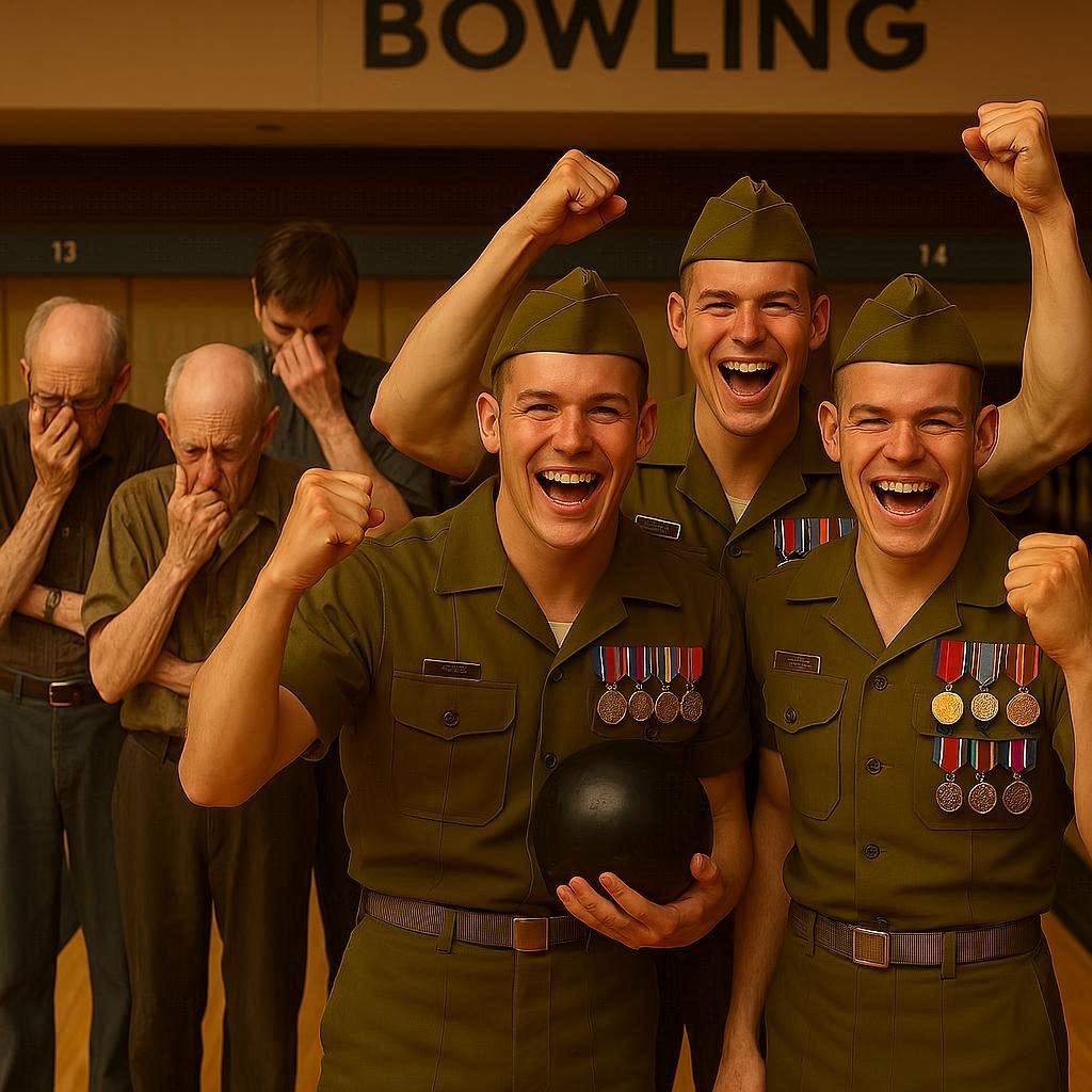Greetings, Bowling Generals, it is I, Pete Hegseth, your Secretary of WAR. Lean in, because Week Seven of Fall 2025… oh man, it was something else. Two teams climbing, two slipping — like strong men scaling mountains of bourbon bottles while others lose their grip and tumble. You could feel it in the air, heavy, like after a long patrol. JoAnne Barber — tough, resilient — fired off a 143 high game and a 393 series for the women. Big respect. But still, a woman. The real proving ground, it’s the men. Nick Kinney — dropped a 226, like a howitzer firing in rhythm. And Matthew Taylor — 605 series. Six-oh-five, gentlemen. That’s not bowling, that’s endurance, sinew, veins pumping, the essence of peak male performance. You gotta read this whole thing, because from here out, we’re not playing by the old rules. The league — this league — it’s war now. And yes, we’ll be making war on our own teams to train, to harden, to forge iron from iron.