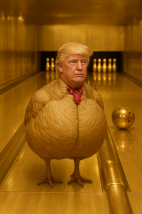 [And then — Trump barges in]: “Let me tell you, folks, the Tariff Turkeys — tremendous team, maybe the best. Scott Murdock, incredible man, incredible bowler. They say he’s #1 Head-to-Head and Most Valuable Bowler — everybody knows it, nobody disputes it. One person disputes it. Chris Lenz. Because he also tied for #1 Head-to-Head, But when that ends in a tie, and I know ties, Trump Ties, they make any suit great again, lined in 24 karat gold thread, very stylish. But Head-to-Head ties are broken by scratch score and Scott, he had bigger numbers. A 542, very strong, very masculine, better than most people even dream. AJ Hofmann, also fantastic. And the name — Tariff Turkeys — comes from me, obviously. They win because they’re tough, disciplined, not weak like Sleepy Joe or Cacklin' Kamala or the woke news media. Everybody knows it.”