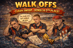 The Walk Offs were swept, and the devastation rolled in slow and heavy, like the credits on a comeback movie that forgot to write the ending. Kurt Fredrickson fought valiantly with a 159 game well above his average and a 421 series, trying to will a late rally into existence that never quite materialized. Chris Hagan stumbled with games well below his average, and Mike Fitzgerald dipped to a 93 game below his average, leaving the lineup scrambling for traction. “We kept waiting for the walk-off, and the game kept walking away from us,” Kurt said quietly, staring down the lane long after the final pin fell. Losing every game made the night melodramatic without being cruel, the kind of sweep that lingers in the silence of the drive home. The Walk Offs now sit in 5th place, slipping one spot in the standings after the sweep.