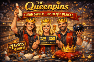 The Queenpins swept all four points and wore their excitement like a crown. Jon Little anchored the royal court with a 183 game well above his average and a strong 501 series, setting the tone with calm authority. Lindsay Sargent erupted with a personal-best 134 game well above her average and a personal-best 358 series, her confidence turning the match into a coronation. Ryan Sisco shook off an early 119 game below his average by surging back with a 182 game well above his average, steadying the throne before the sweep could wobble. “Once the crown settles, you stop worrying about who is reaching for it,” Jon laughed as the team celebrated another clean royal decree on the lanes. The Queenpins now sit in 4th place, climbing one spot in the standings after the sweep.